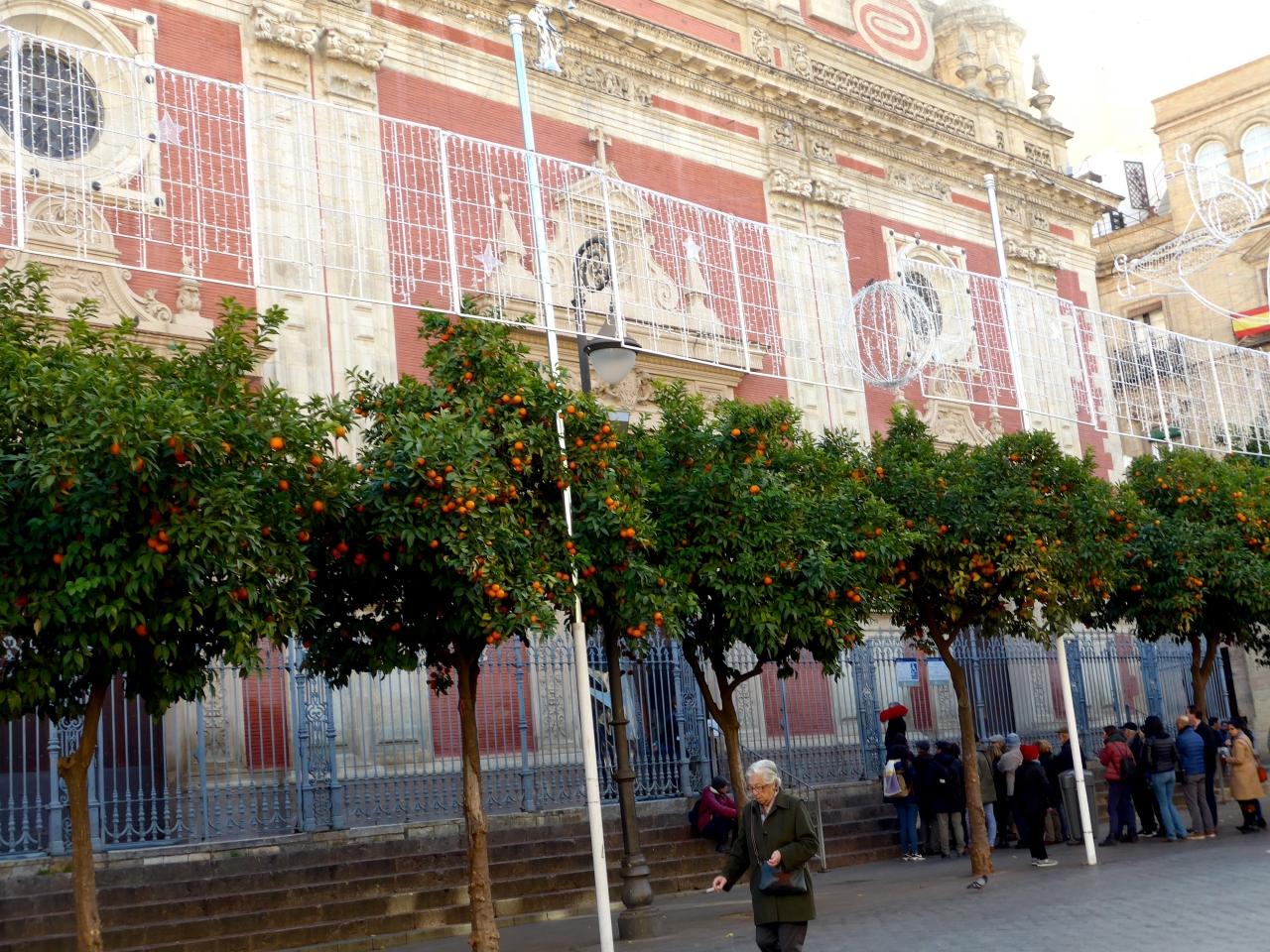 1108 カテドラルまで来た.なっなんだ 一杯人が待っているぞ!まさか...ここからヒラルダの塔が見える.イスラムのミナレットとキリスト教の鐘楼が融合したような塔だ