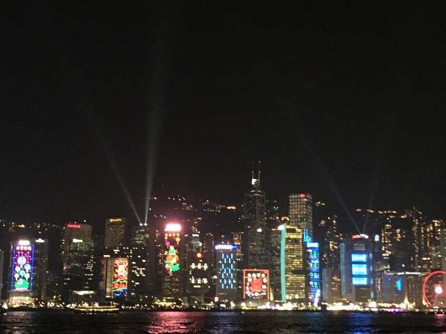 シンフォニーオブライツの始まりです。街中を使った演出は凄いです。スターフェリーの九龍がわの乗り場の隣の香港文化中心前から観ました。音楽も聞こえて最高です。