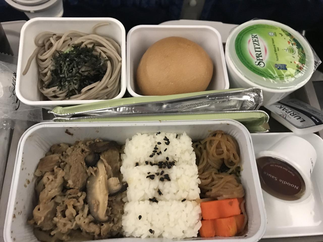 機内食はこんな感じ。チキンとビーフから選べます。“cya”はビーフ。