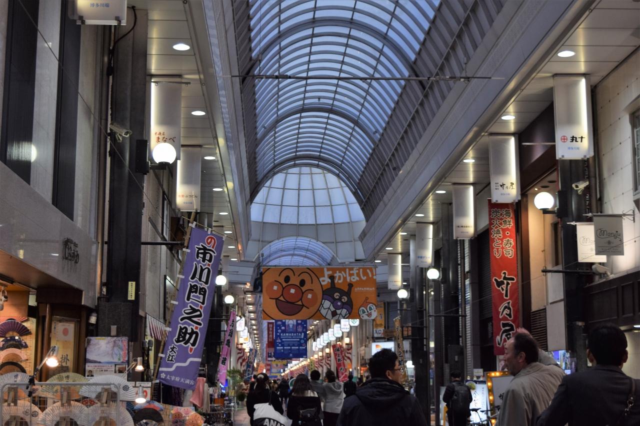 この商店街は、博多リバレインからキャナルシティ博多までのおよそ400メートルのアケードです。