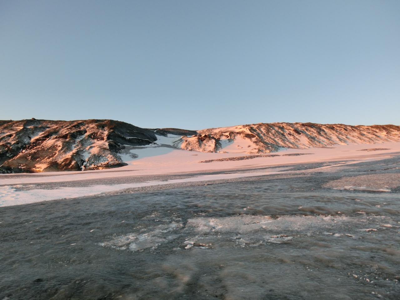 氷の斜面をハイキング。遮られるものがないからか風がとても強いです。