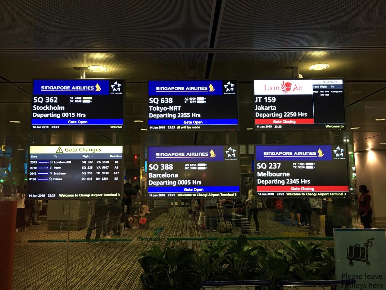 深夜のチャンギ国際空港はシンガポール航空のフライトがいっぱいです。