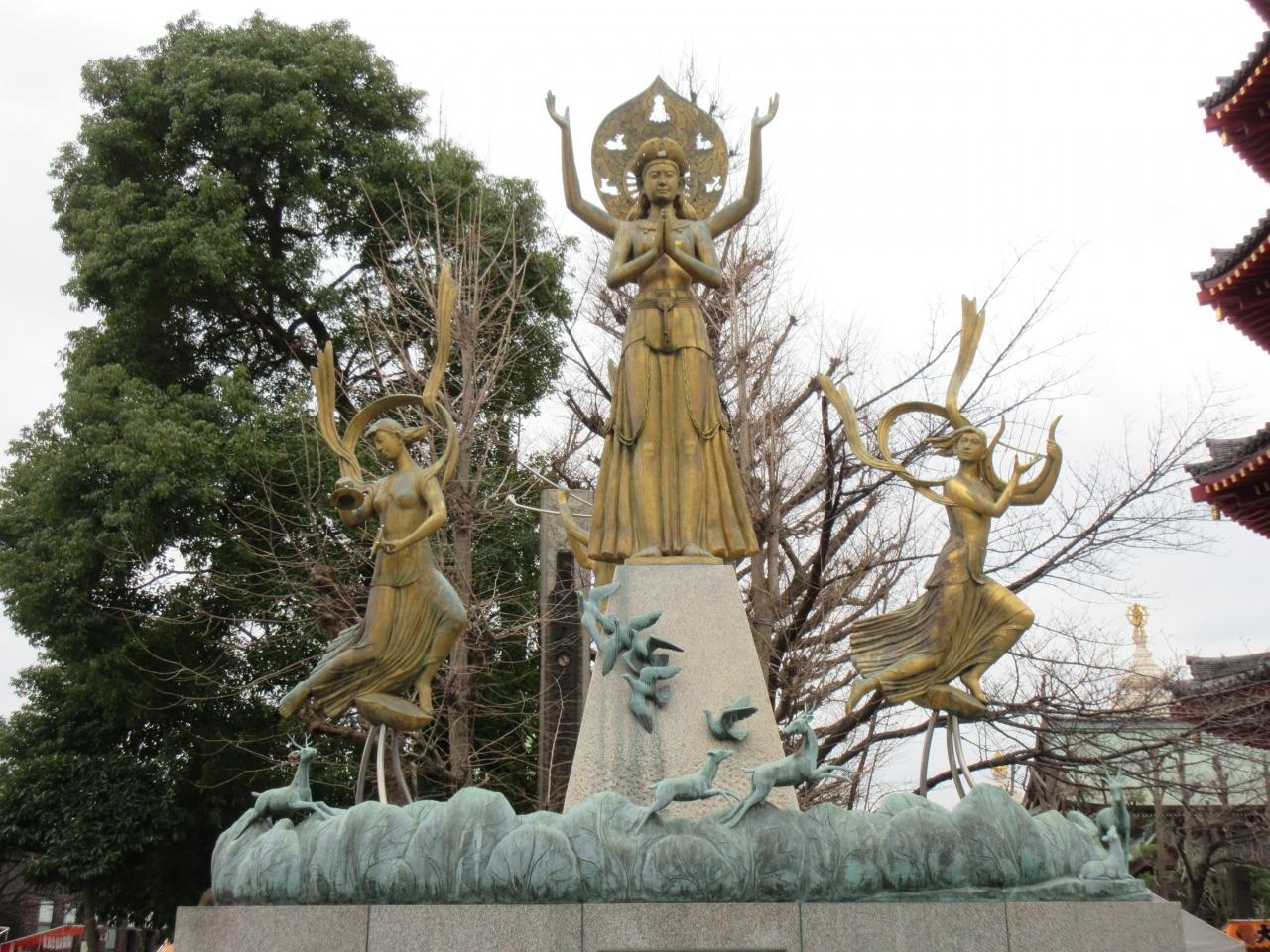 やすらぎ橋の先に建つ、金色に輝く降魔成道釈迦如来像。