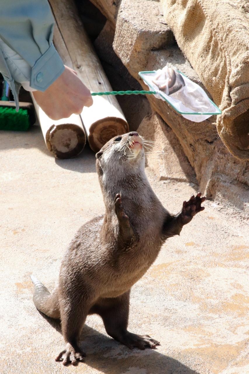 今回ぜひ見逃したくないと思ったのは、レッサーパンダ展示場のすぐ隣のコツメカワウソの食事タイム(ドジョウ・タイム)でした。