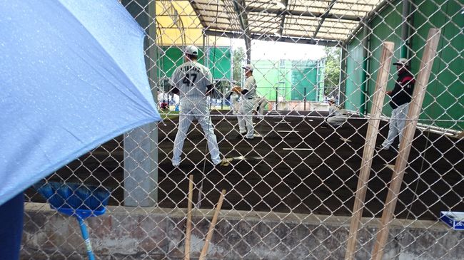 ブルペンに行ってみる。ここしか行くところがないためか人が多く、傘の合間から覗き見る感じ。