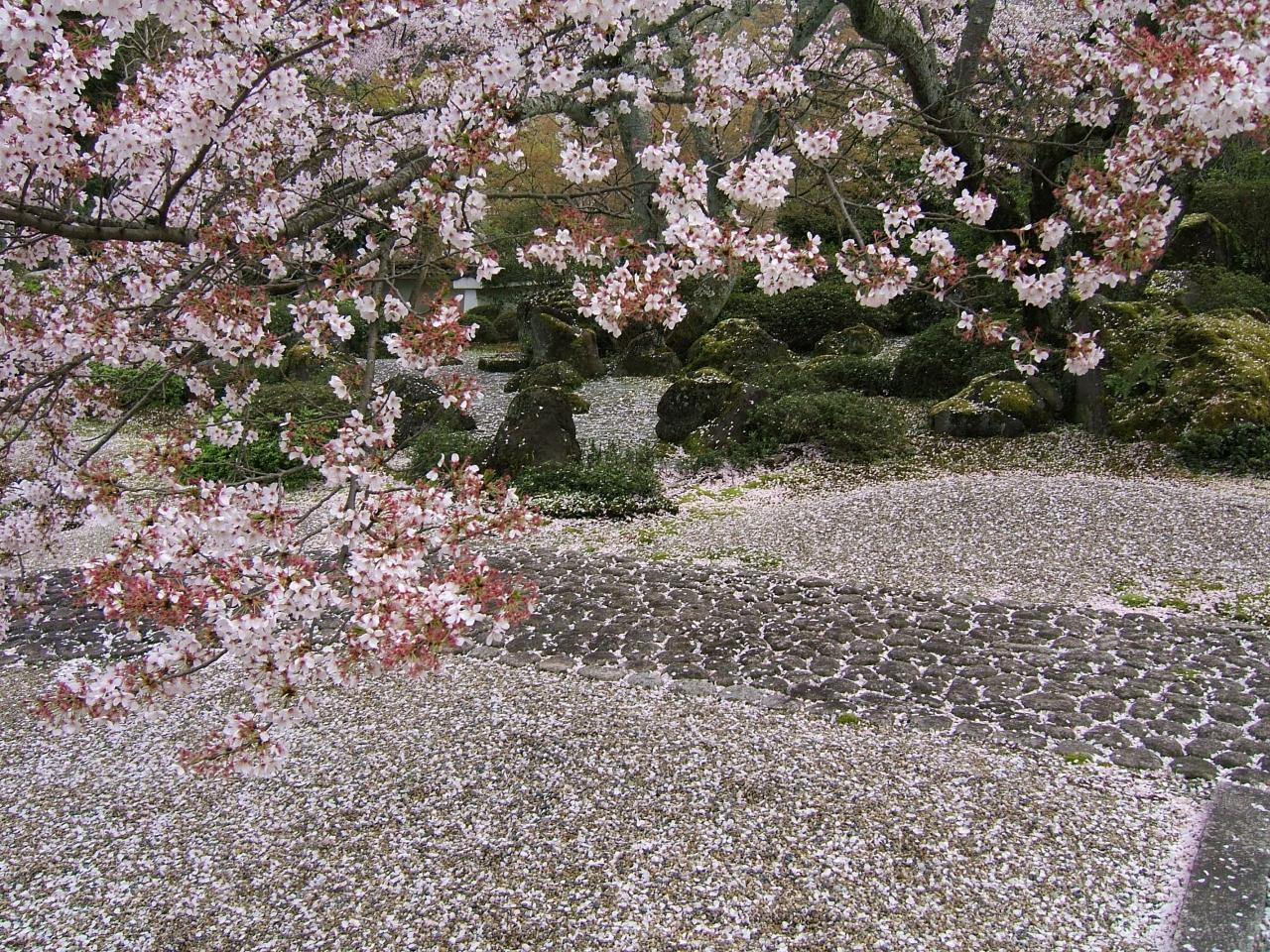 散りかけで境内はピンクの絨毯です