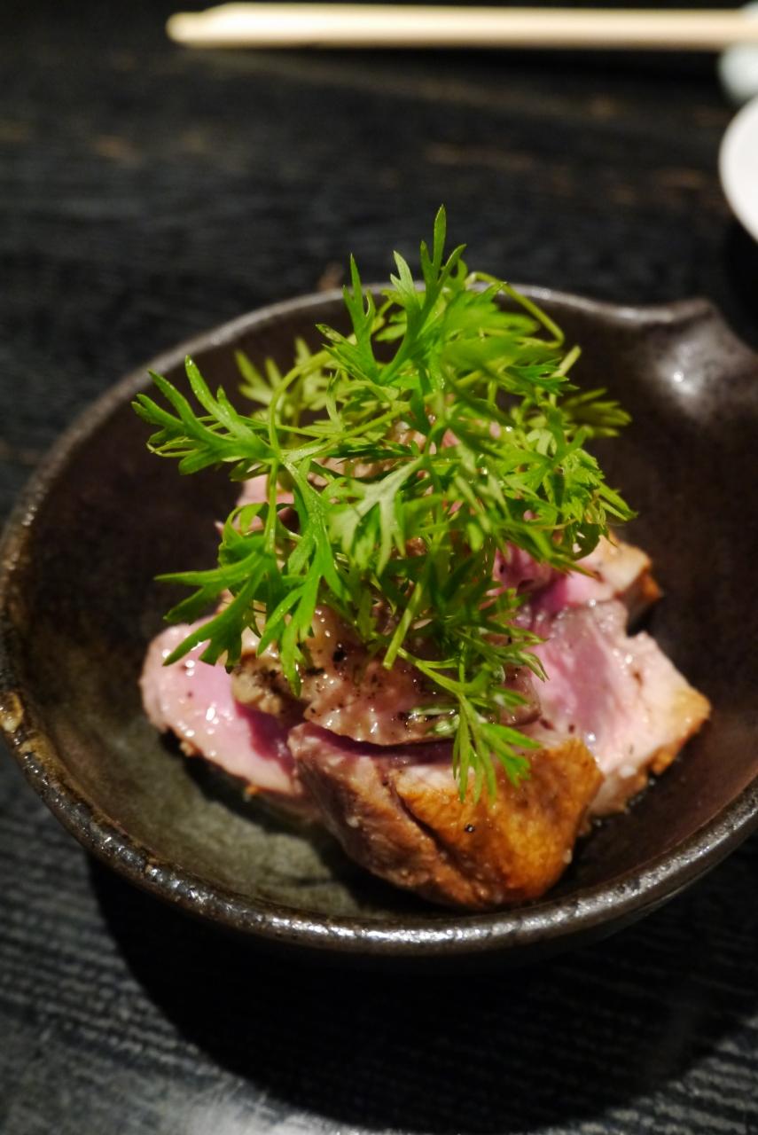 お蕎麦屋さんだしね、とまずは厚切り鴨ロースの炙り焼き。 -