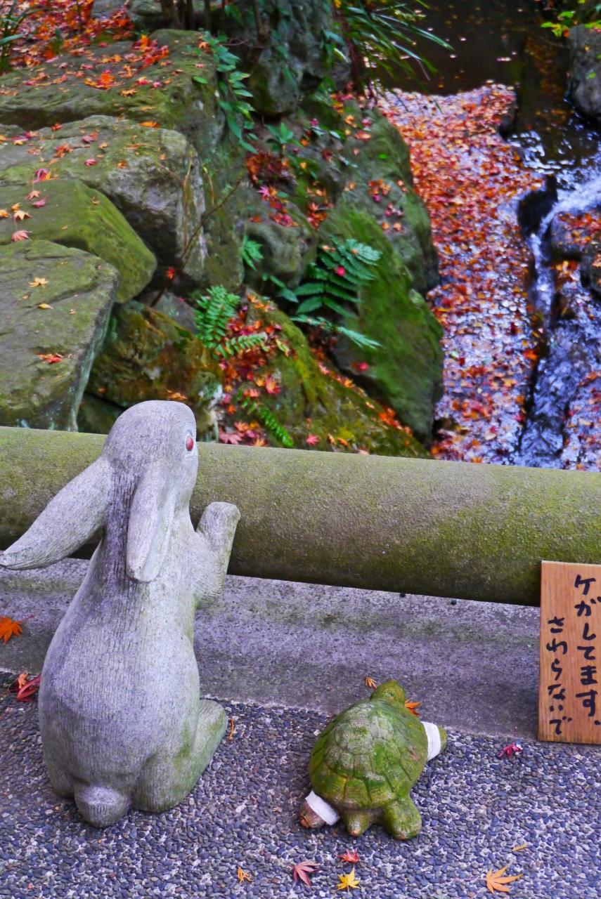 うさぎと亀が、川沿いの紅葉を眺めています(´∀`*) -