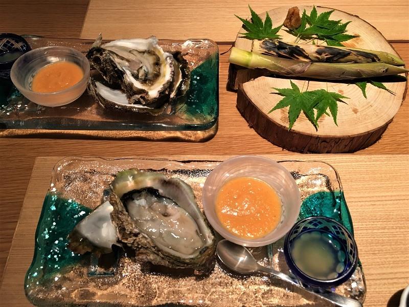 こちらは追加料理の岩牡蠣(800円,税別,写真は2人前)と月山筍(1200円)。
