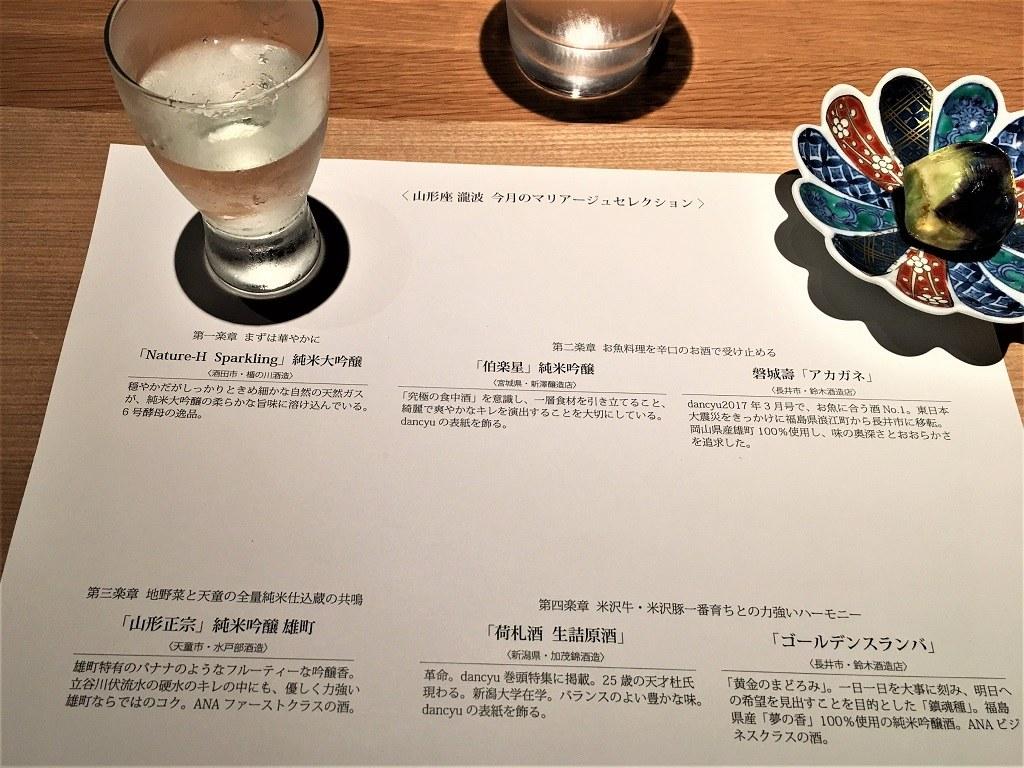 お酒は日本酒のペアリングでお願いしました。「日本酒マリアージュセレクション」という100mlずつ6種類の日本酒のセットで,値段も4,000円(税別)とお手頃です。