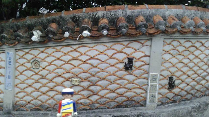 石敢當、シーサー、焼物が埋め込まれているかわいい壁。