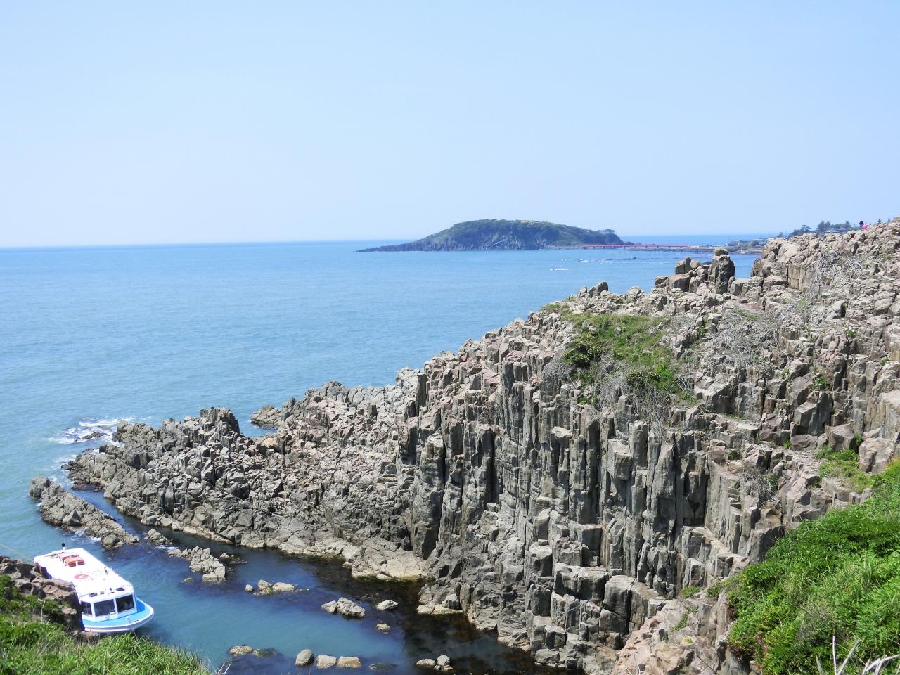 波の浸食によって荒々しくカットされた岩肌の柱状節理が約1kmに渡って続いてます。