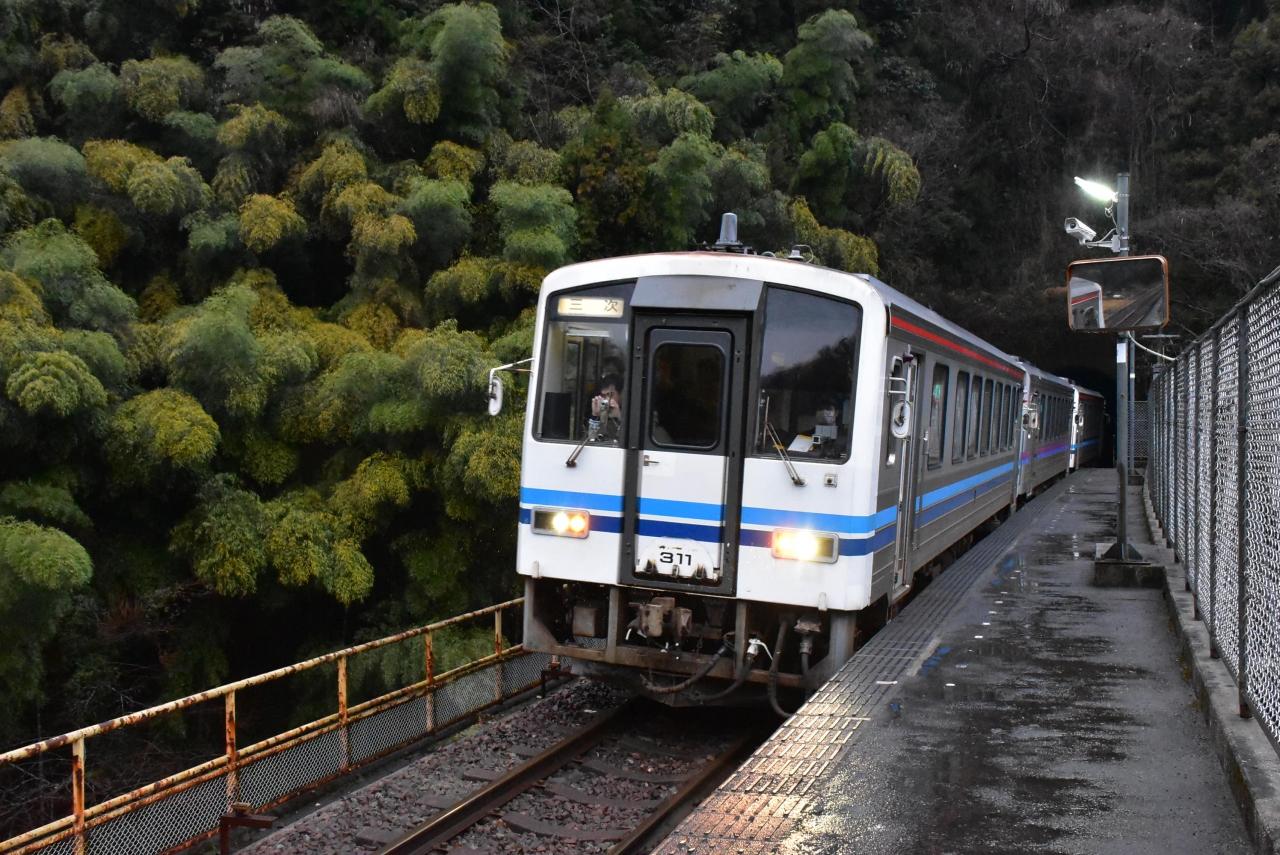 三江線の浜原行きは前照灯を点灯し、まもなく発車します。