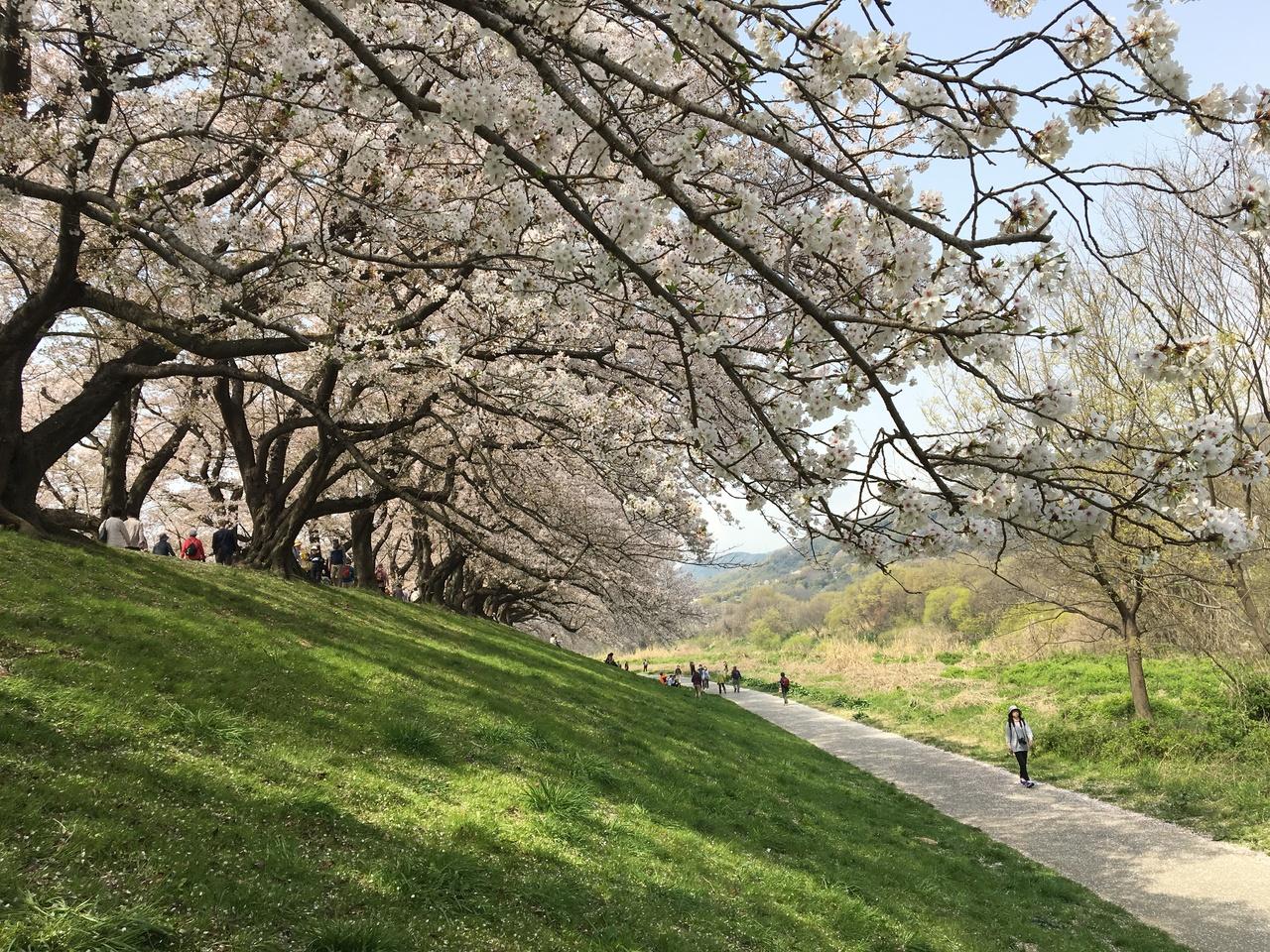 木津川、宇治川、桂川の三川合流点にある背割堤。1.4キロに250本の桜並木のトンネルを歩いてお花見が楽しめます。