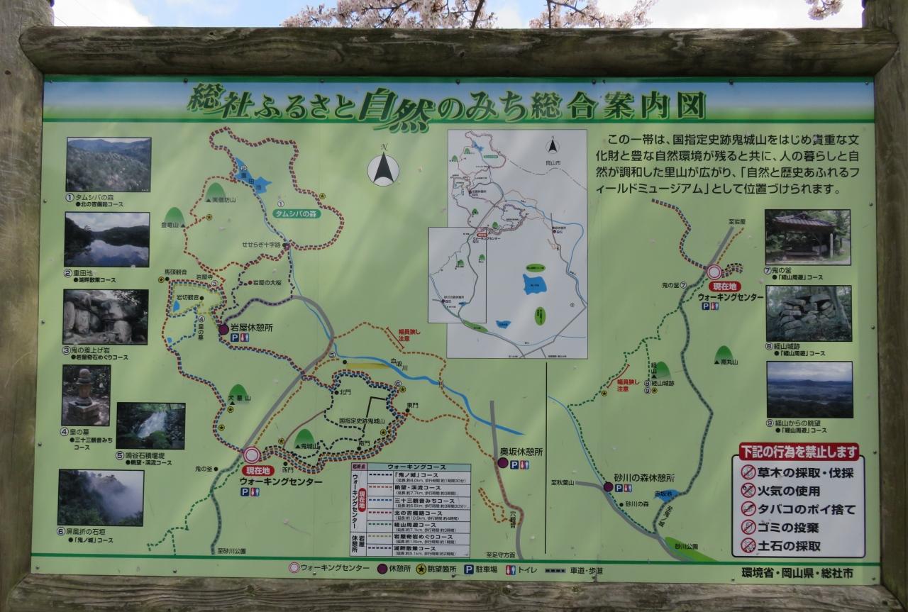 ビジターセンターでの展示品見学と、鬼ノ城についての説明をお聞きした後、次は現地見学です。写真入りのこの観光案内には、『総社ふるさと自然のみち総合案内図』のタイトルがありました。広域のウォーキングコースの案内でした。(同上)