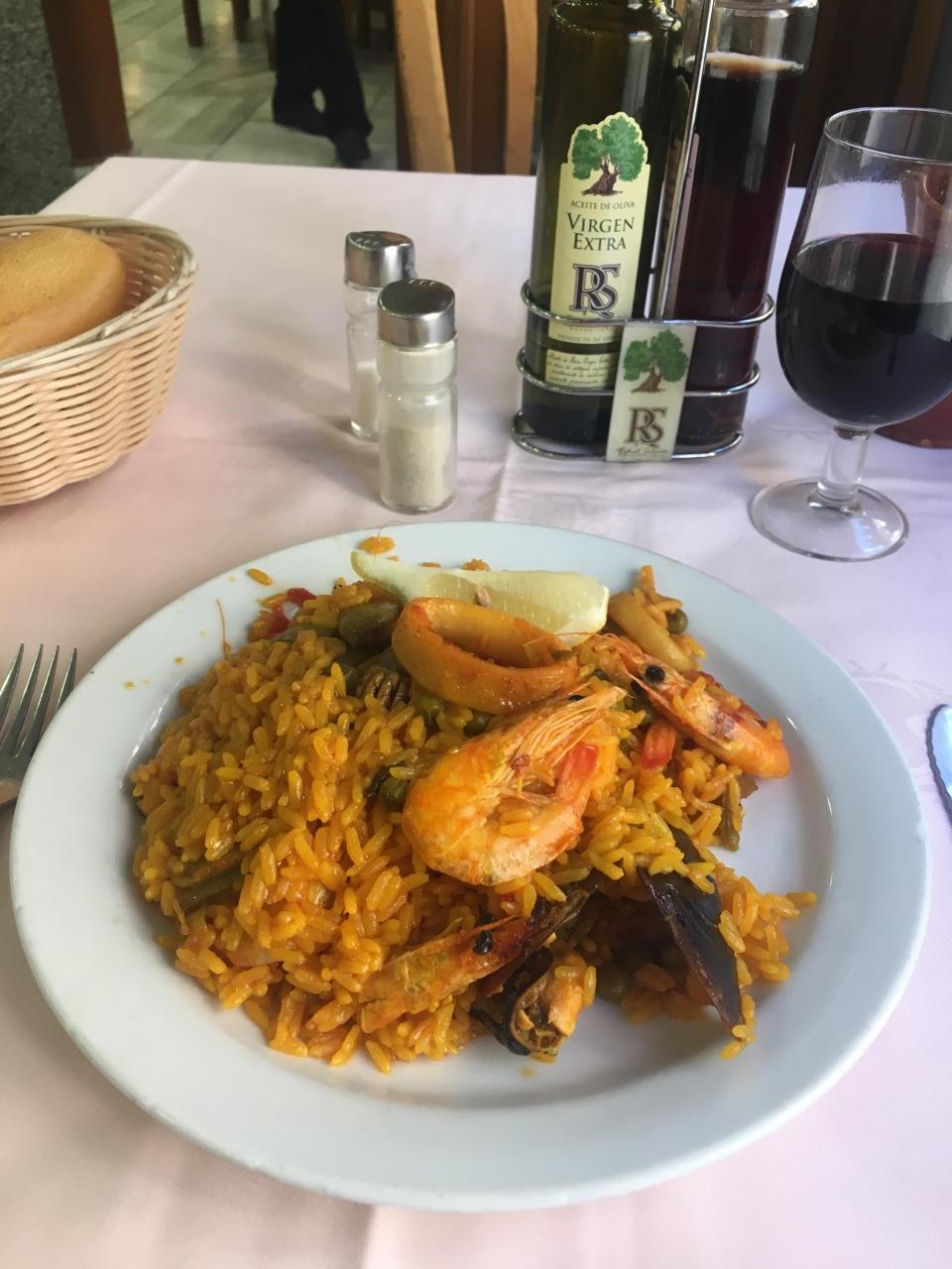 飲み物はワイン、一皿目はパエリアです。具だくさんで美味しい。