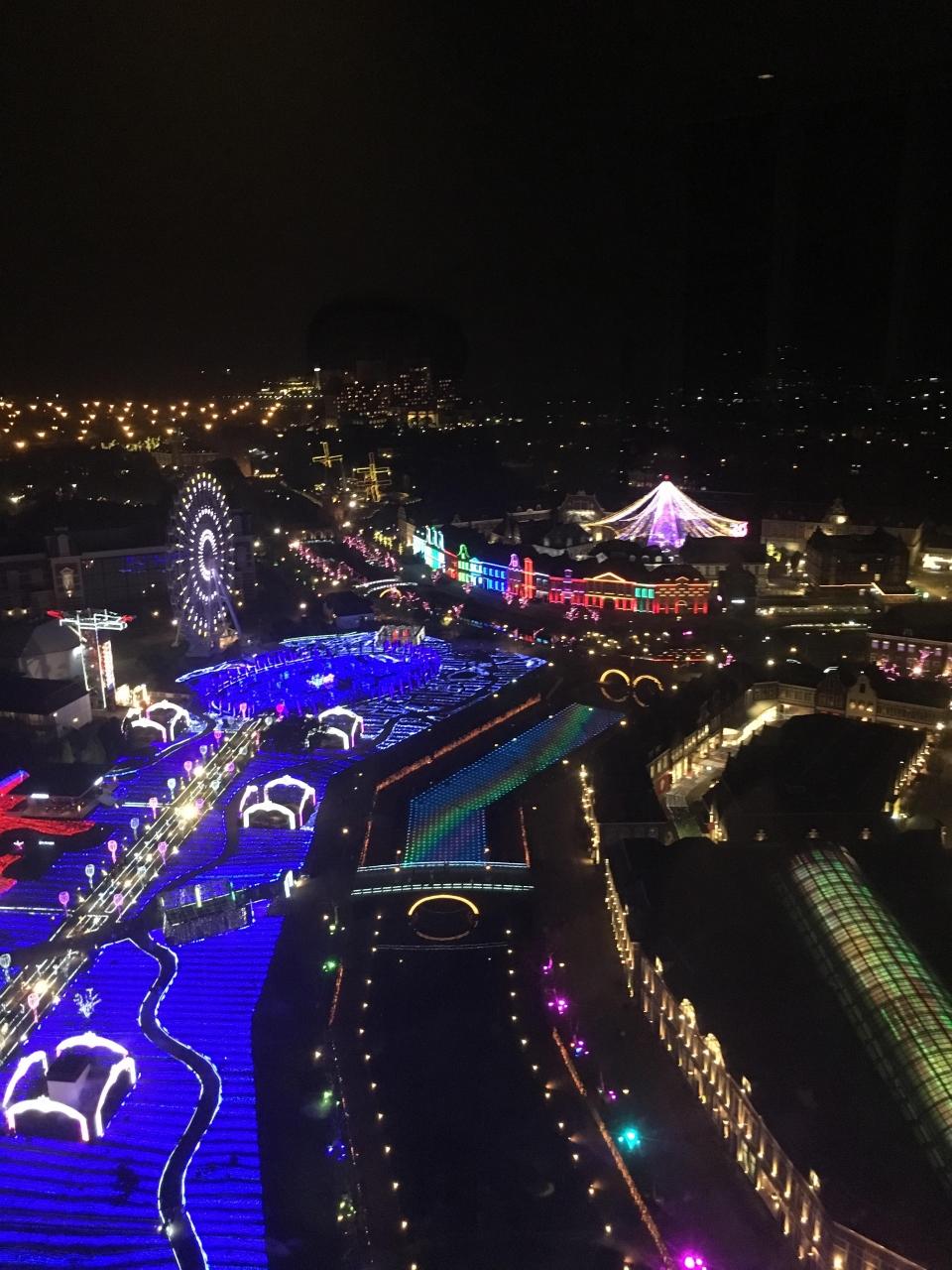 タワーからのイルミネーション。全体がきれいに見えます。歩いたり船に乗ったり、閉園ぎりぎりまで、イルミネーションを楽しみました。満足だろうな、丸一日いれば。
