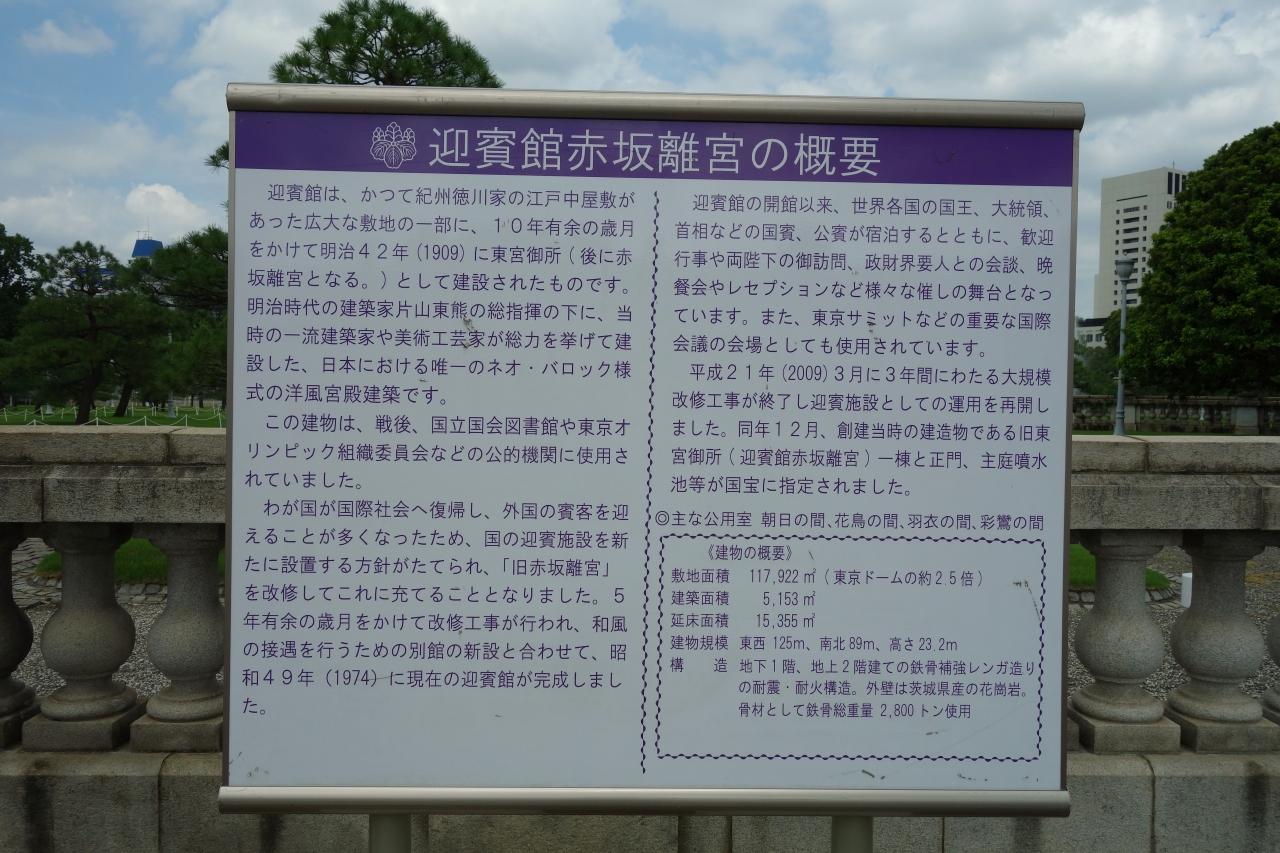 此処、元赤坂に在る迎賓館の建物は、東宮御所として明治42(1909)年に建設されました。鹿鳴館などを設計したお雇い外国人建築家ジョサイア・コンドルの弟子にあたる宮廷建築家片山東熊の設計により、元紀州藩の屋敷跡(明治6年宮城火災から明治21年の明治宮殿完成までの15年間、明治天皇の仮御所が置かれていた)に建てられました。が、そのネオ・バロック様式の外観があまりにも華美に過ぎた事や、住居としての使い勝手が必ずしも良くなかった事から、皇太子嘉仁親王(後の大正天皇)がこの御所を使用する事はほとんど有りませんでした。嘉仁親王が天皇に即位した後は離宮として扱われる事となり、その名称も赤坂離宮と改められました。