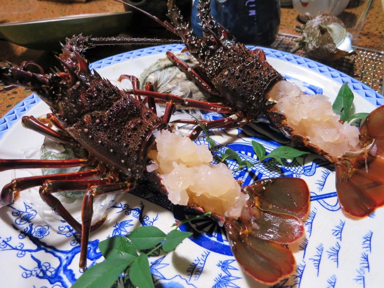 夜の宴は豪勢に船盛・伊勢海老・アワビ・サザエといただきました。