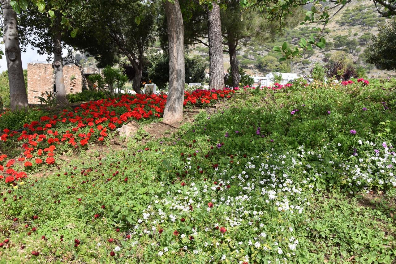 いろとりどりの花がきれい。左奥に茶色の建物の展望台が見える -