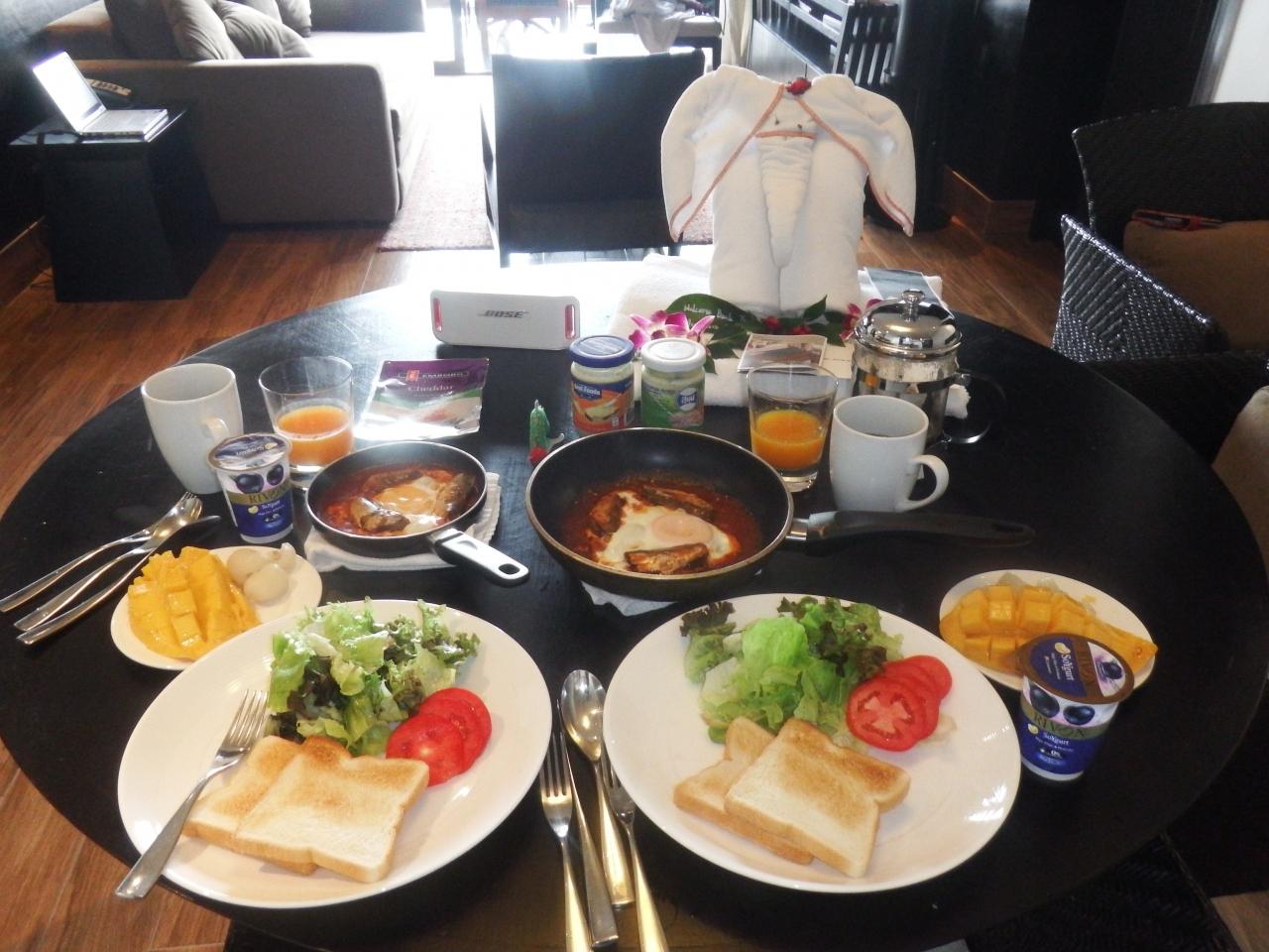 しばらく待っているとようやく雨が上がり、ホテルに帰ってきました。部屋に帰って、皿に盛りつけて本日のディナー!本格的なタイ料理が安く簡単に食べられるので、超ご機嫌!ъ( ゚ー^)イェー♪