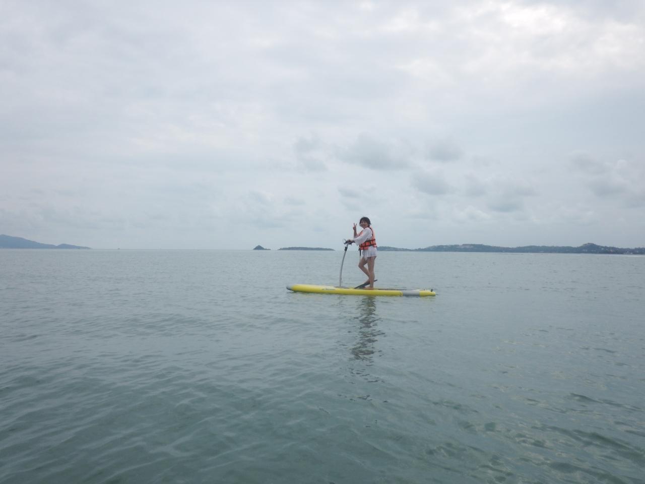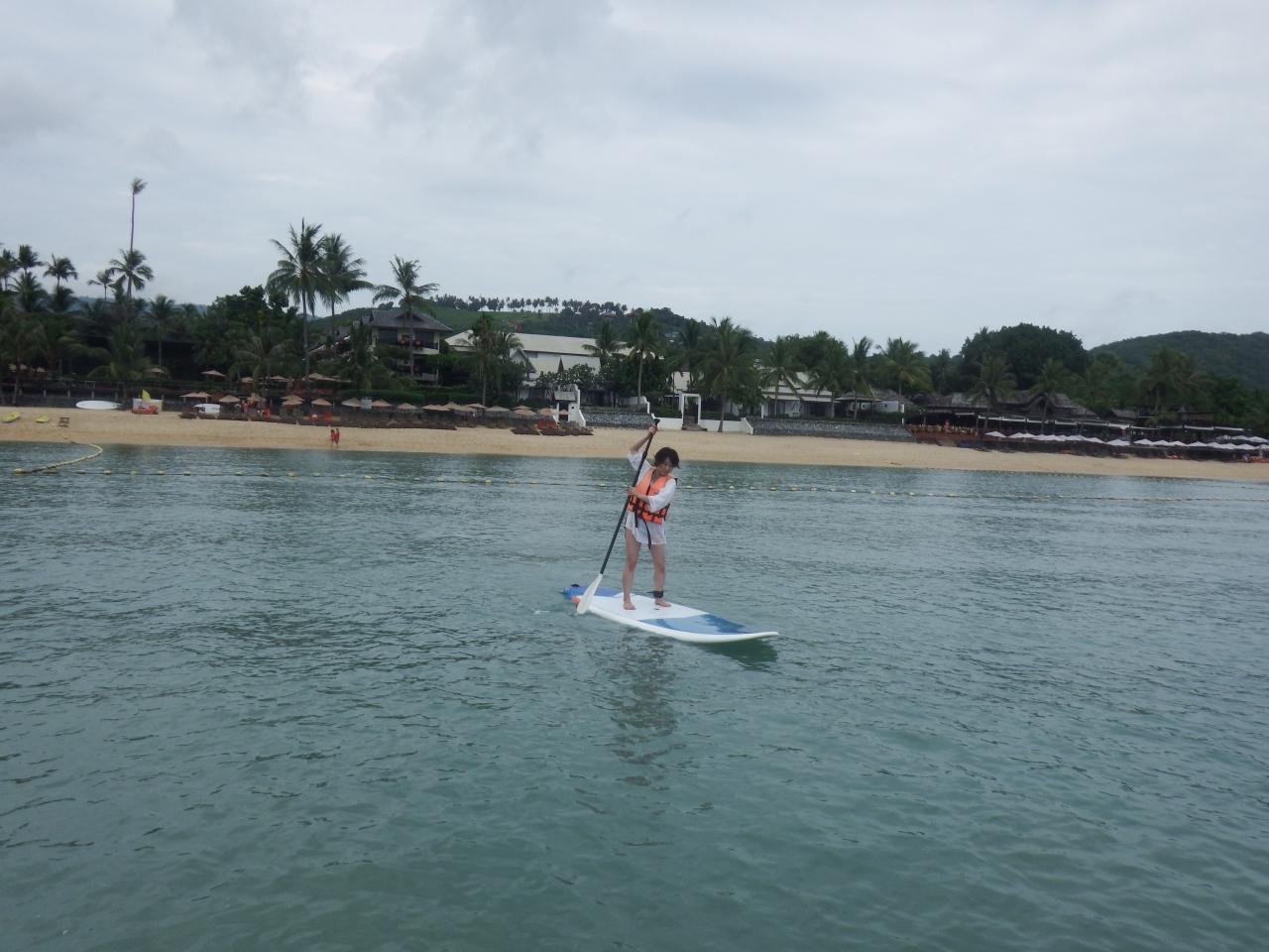 ホテルで借りたパドルボートで遊びます。パドルボートは簡単そうに見えますが、意外とバランスを取るのが難しいです。特にスピードを出して漕ごうとすると、転倒しそうになっちゃいます。