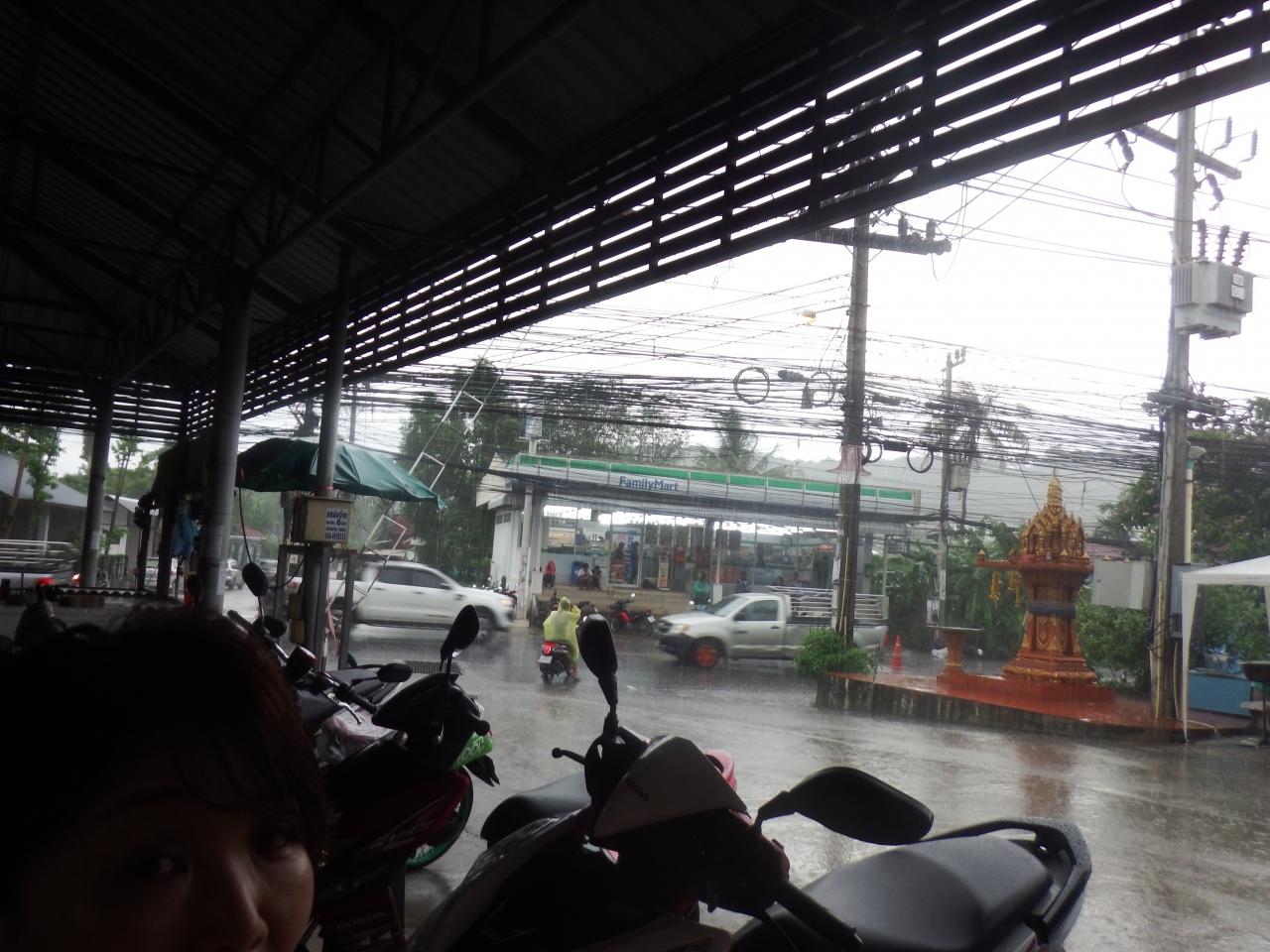 買い出しが終わり帰ろうとしたら、突然の大雨が!!とても帰れないので、しばらくマーケットで雨待ちです。