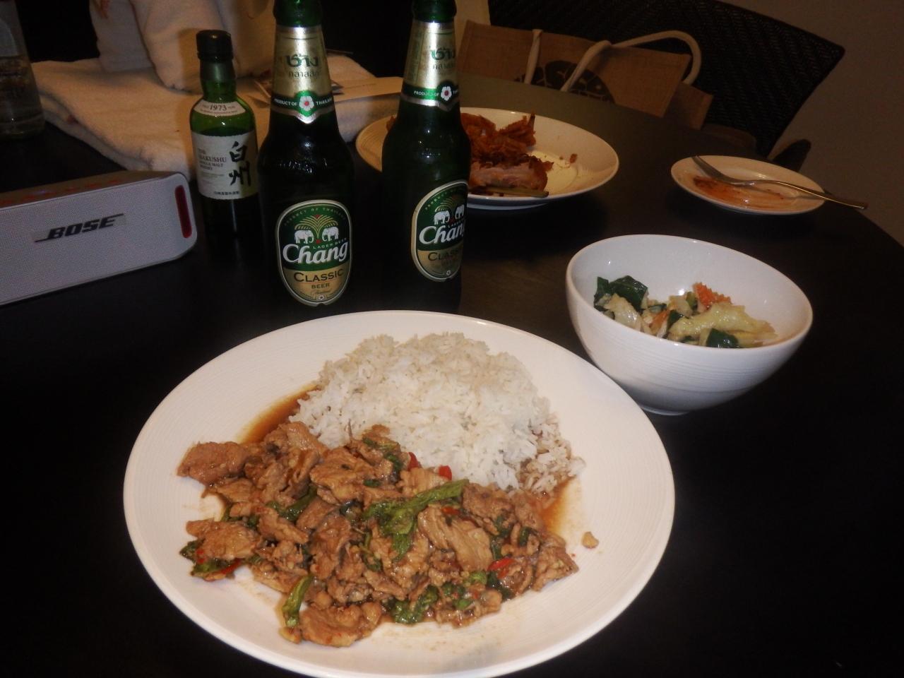 帰りにローカルな食堂で、ガパオと野菜炒めを購入。本日のディナーです。