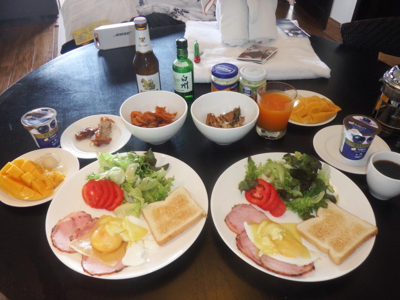 今朝も部屋で朝食を取ります!買い込んでおいたパンとサラダ、フルーツですが、盛り付けたら豪華になっちゃいました。