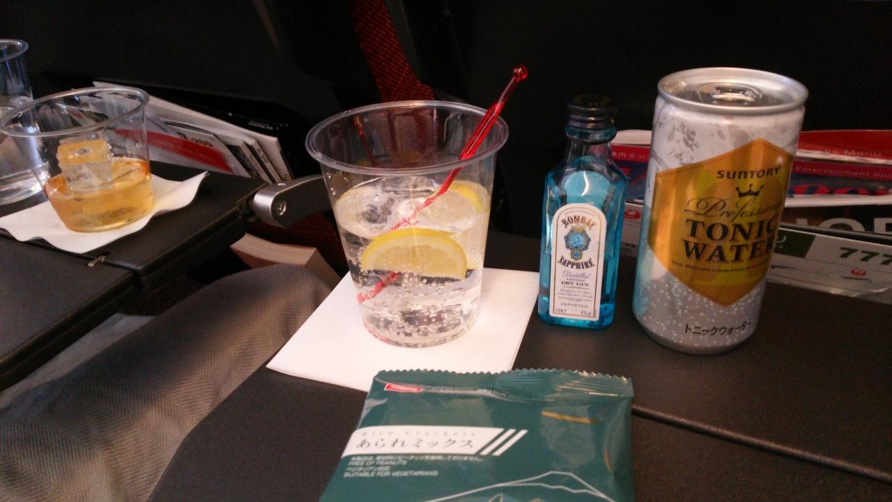 機内サービスでジントニックとシーバスリーガルを頂きます。