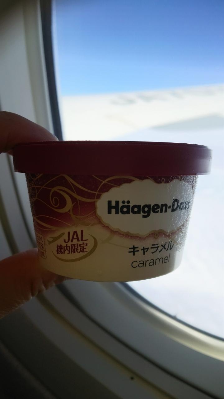 食事後に、アイスが配られました!JAL限定のキャラメル味だそうです!