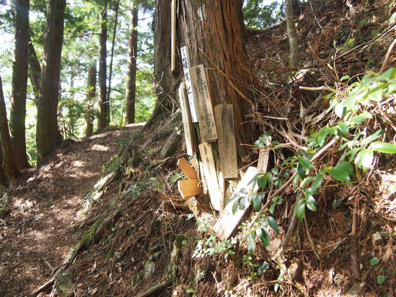 熊野川の蛇行を眺めて進むと山在峠の宝経塔に出てきます。広いスペースになっていて行場になっているのが分かります。