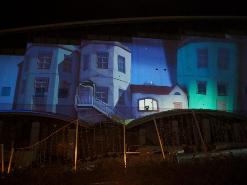 プロジェクションマッピングは、スギノイパレスの2階壁に上映されます。