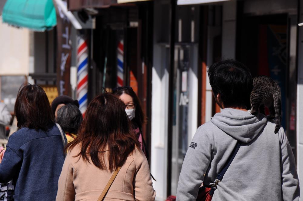 雛飾りを観ながら歩いていたら、猫を肩に乗せた人とすれ違った。