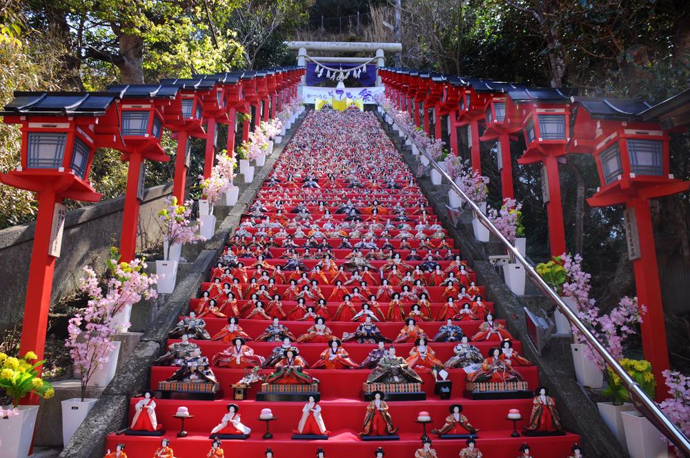 遠見岬神社の石段の雛飾りは壮観ですね。