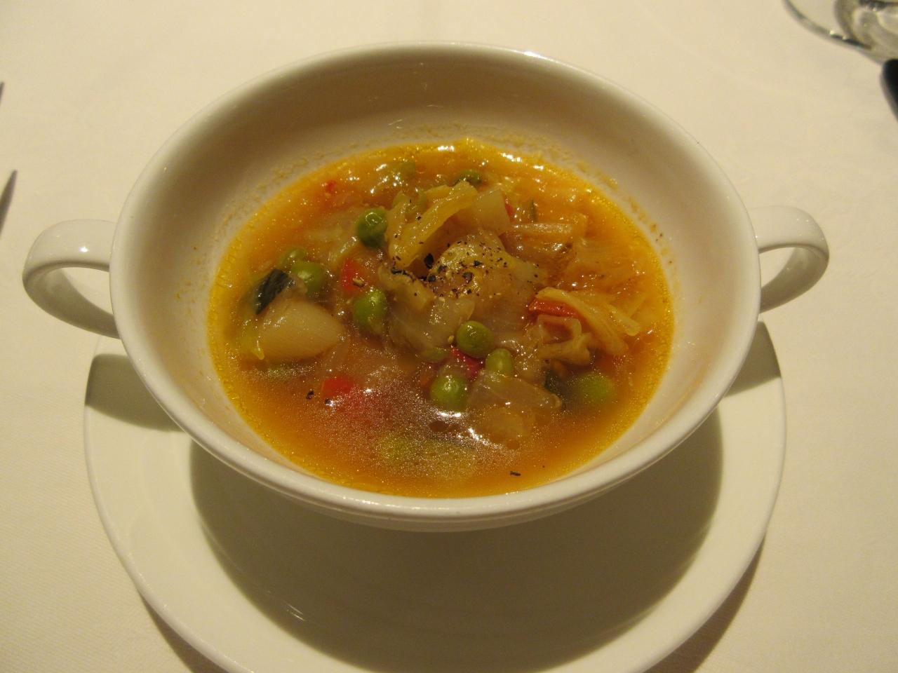グリーンピース・パプリカ・玉ネギ・筍・ズッキーニ・人参が入った春らしい野菜スープ、グリーンピースの香りも爽やかで塩味も丁度良く美味♪