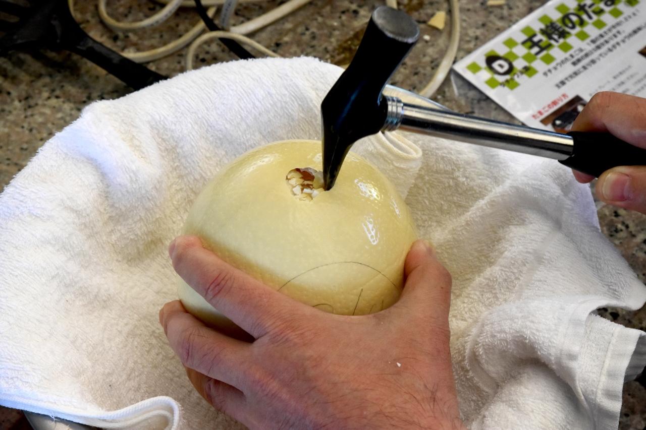 ハンマーで丁寧に卵のからを割ります。