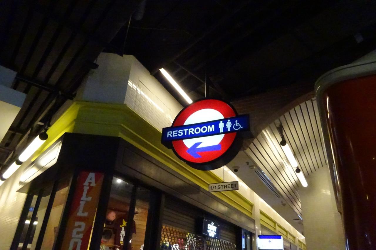 トイレまでの通路がプラットフォ-ムのよう。トイレの扉には地下鉄の路線図が・・・。ちなみに日本のフロアには山手線の駅名がありました。