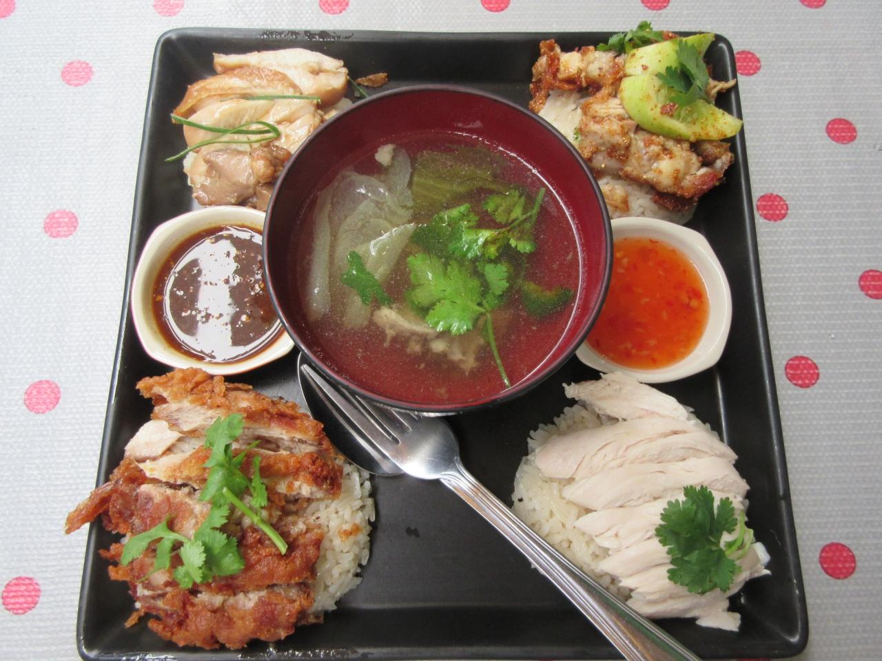 朝食にはちょっとボリューム有りですがカオマンガイ4種を食べます。 -