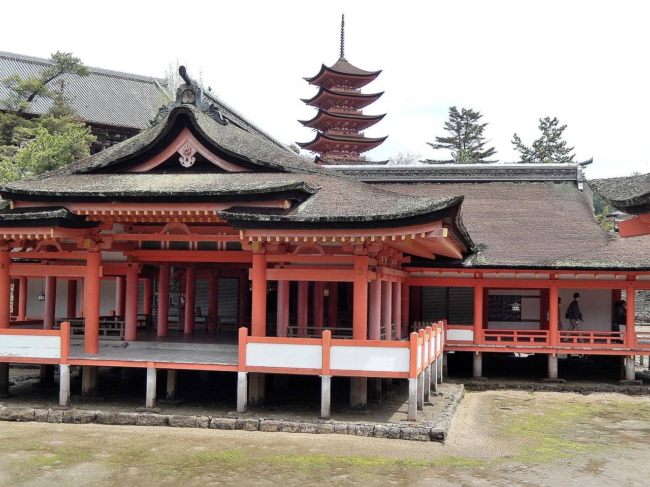 千畳閣の横には、朱色が美しい五重塔が見えています。これも現在は豊国神社の五重塔だそうですが、元は亀居山方光院大願寺の塔でした。13世紀初頭に建てられた真言宗の古刹で、明治初頭の神仏分離令までは嚴島神社の普請奉行として一切の修理・造営を司ってきました。無理やり神仏を分けたので、塔の中にあった仏像は大願寺に移されたと聞きましたよ。