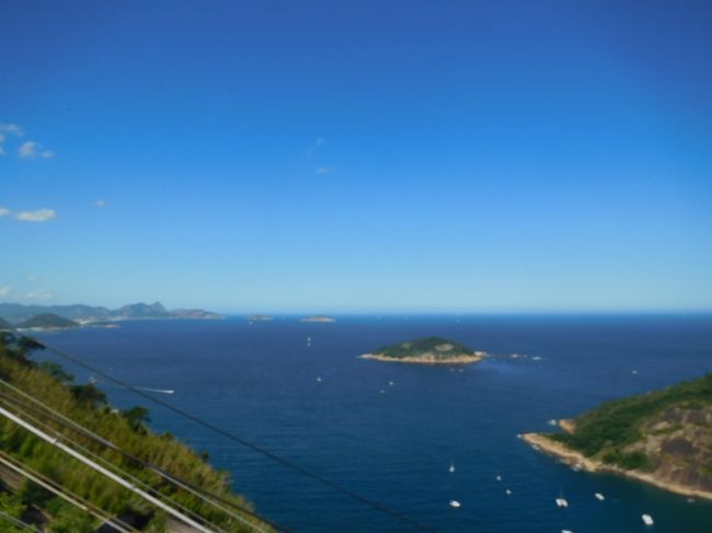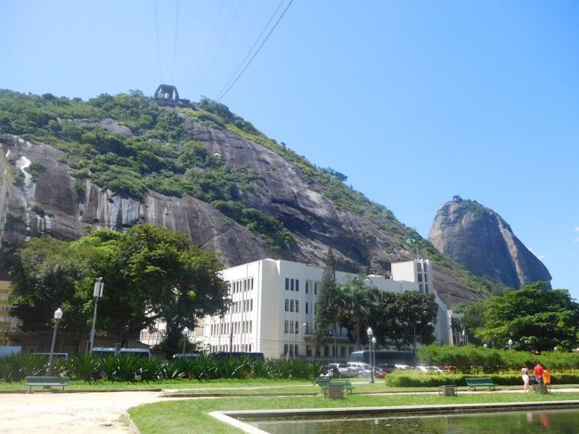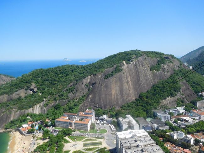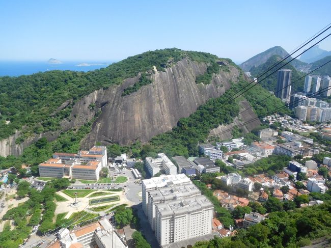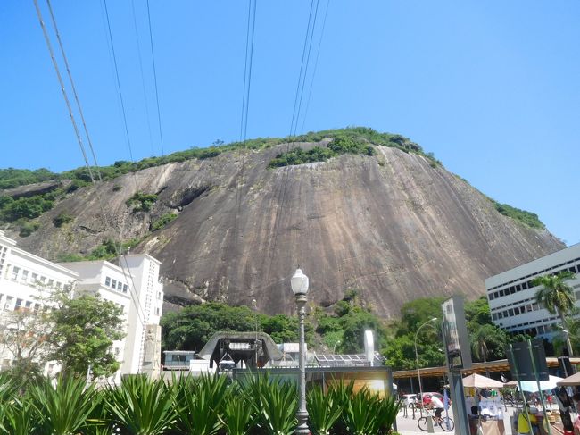 コルコバードの丘への登山電車の駅から約20分の13時頃、ポン・ジ・アスーカへのロープウェイ乗り場に到着しました。写真はポン・ジ・アスーカの反対側の岩山です。コルコバードの丘からも見えましたが、リオデジャネイロは本当に岩山、奇岩が多いですね。