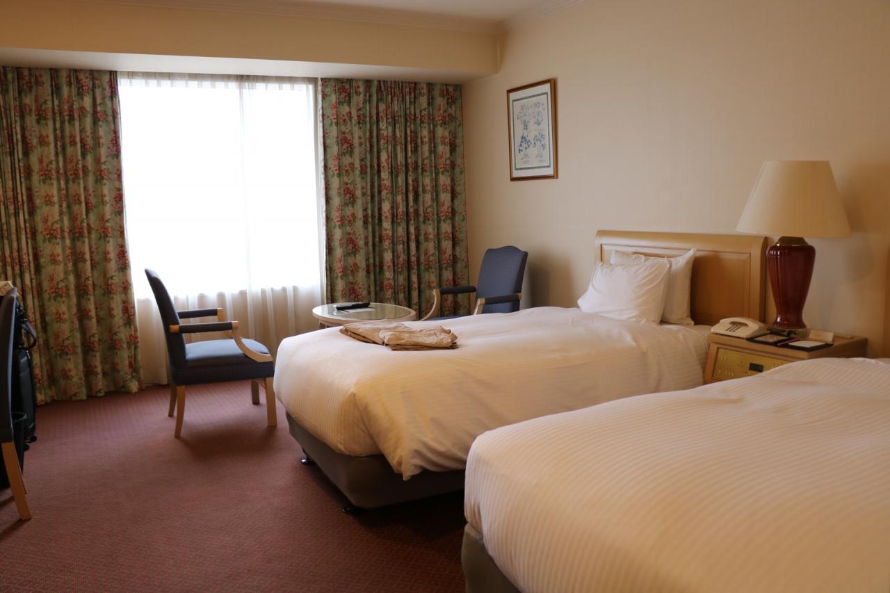 部屋は、旧旭川グランドホテル当時の物なのか、典型的な地方のシティホテル。ビジネスホテルより広い部屋に、ヘッドボードがあるベッド2つと、丸テーブルに椅子等がある。