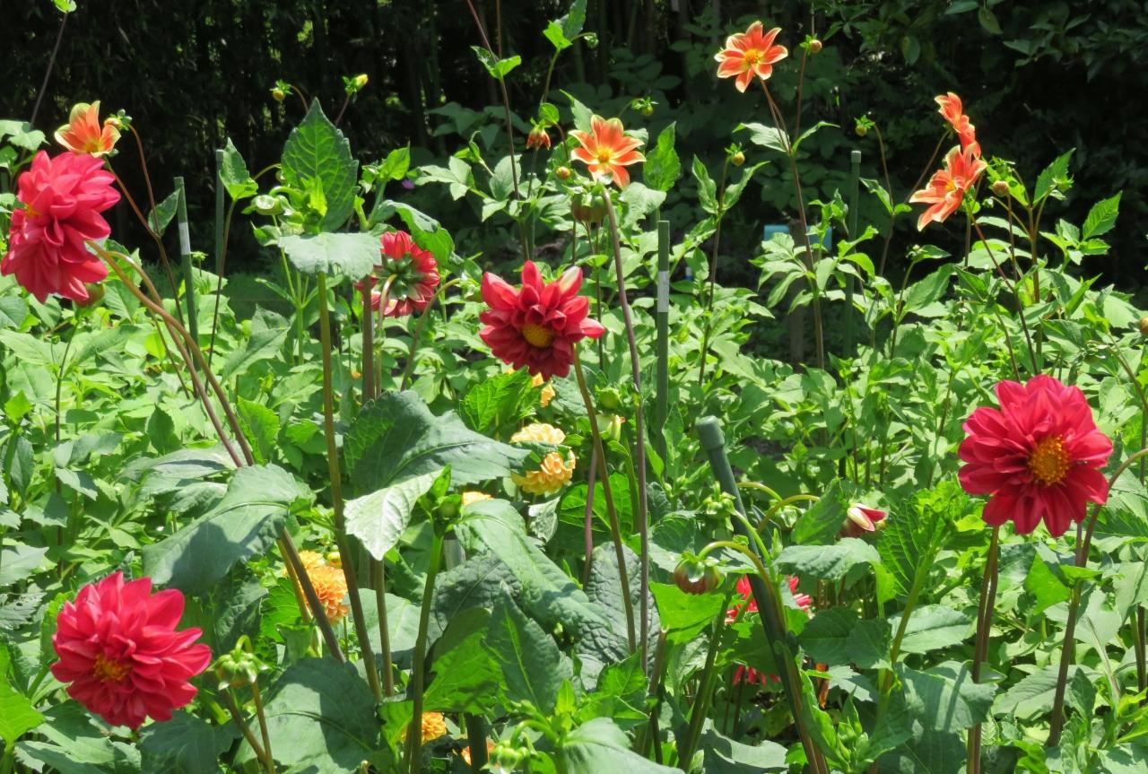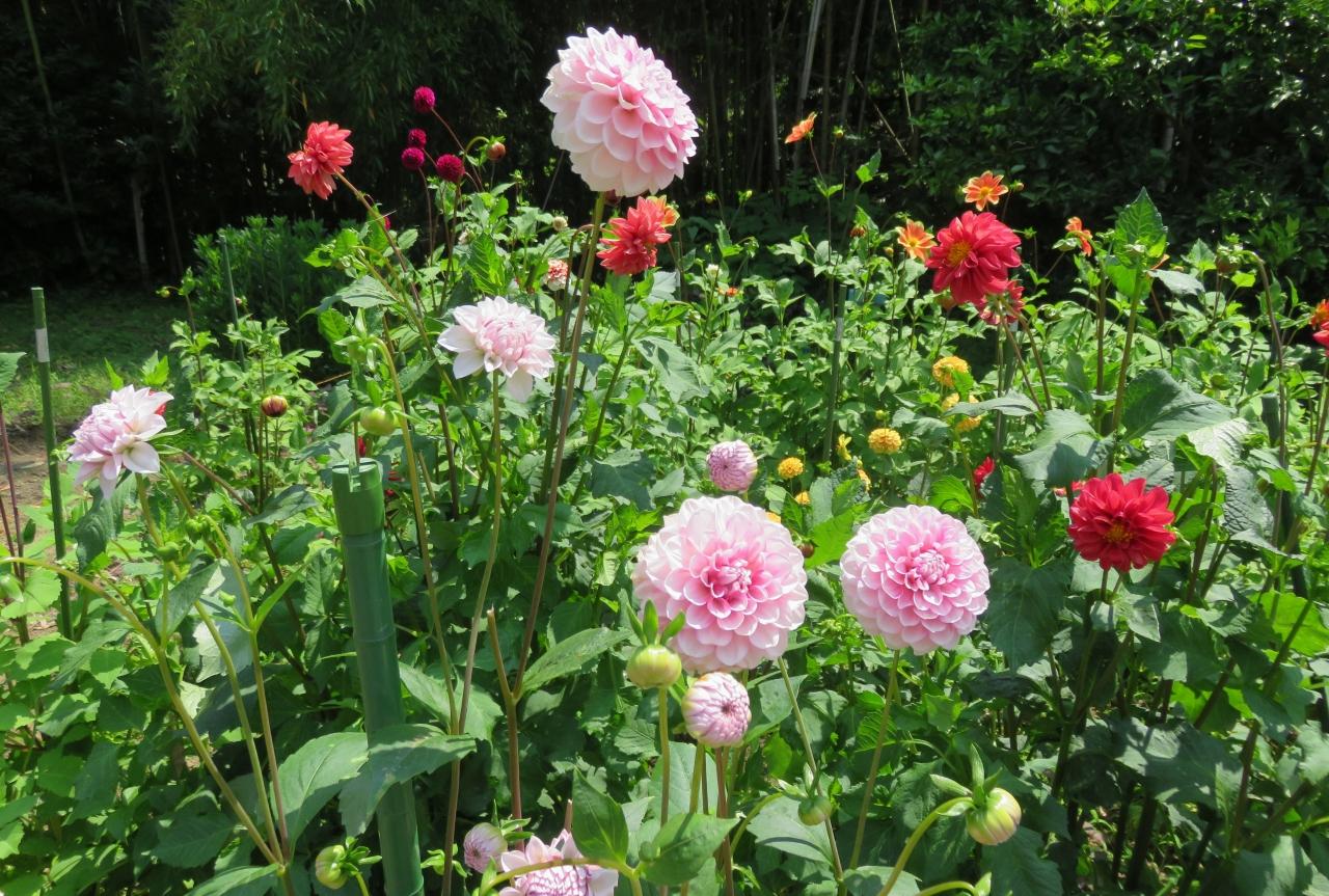 ダリアの花の光景です。まだ蕾がたくさんありましたが、見頃を迎えたピンクや赤色の花もありました。『ダリア』の名前は、スウェーデンの著名な植物学者のリンネの弟子のアンデシュ・ダール (Anders Dahl) に因みます。