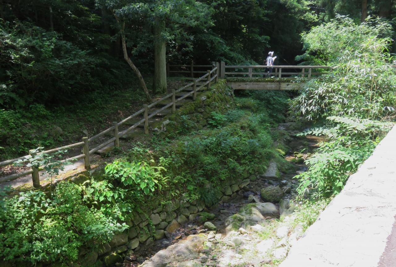 銀山川と、その上に架かる小橋の光景です。銀山川の対岸にも、柵が設けられた遊歩道がありました。目的地の流産寺間歩が次第に近付いてきたようです。