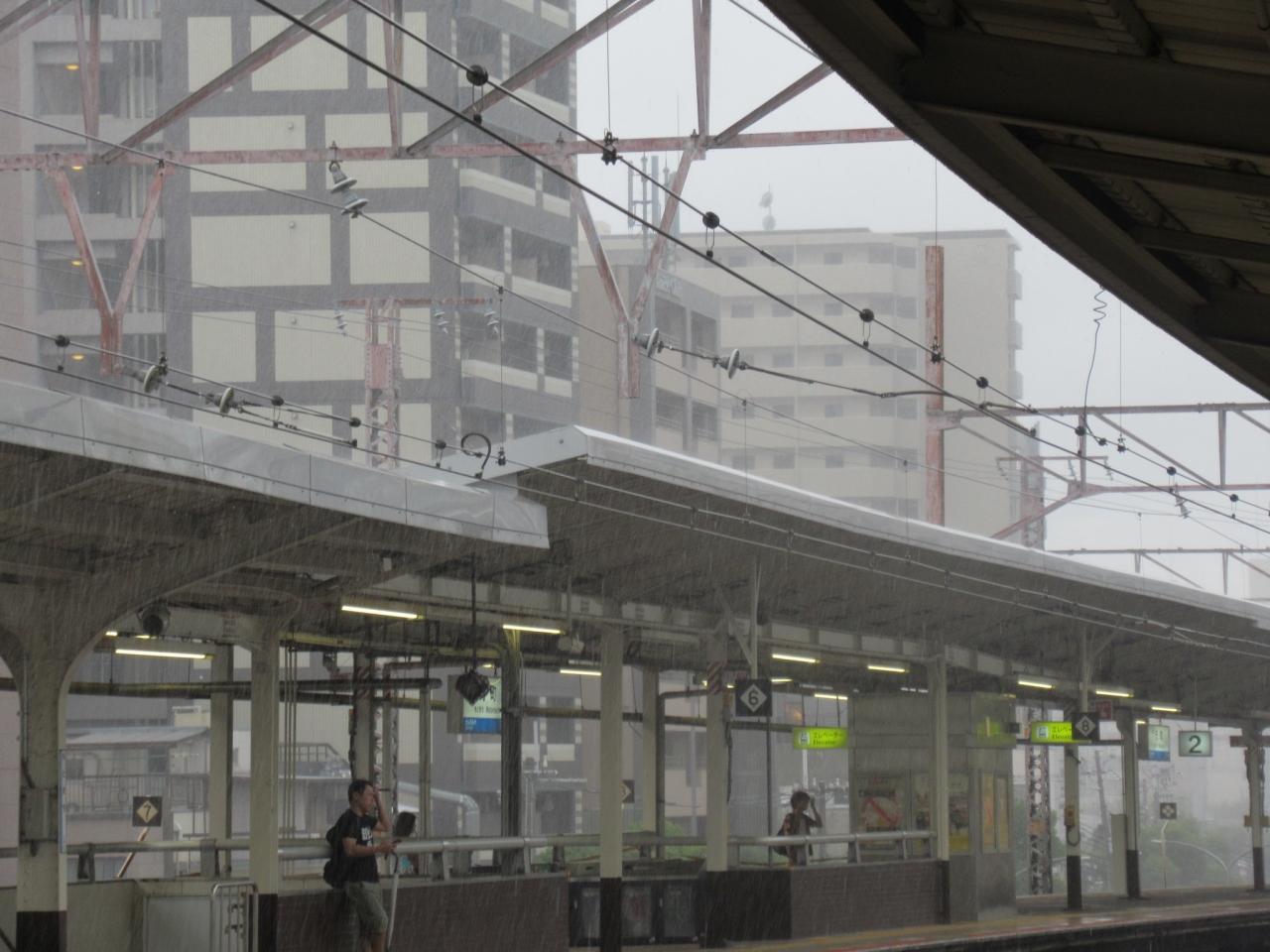 無事に乗車券も改札を通り、ホームにでてしばらくしたら、通り雨というには激しい雨。
