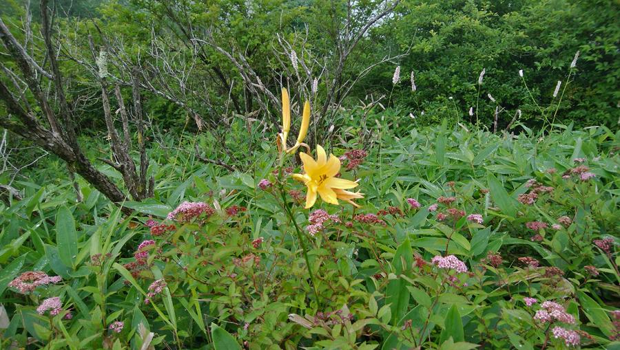 ニッコウキスゲや赤花シモツケソウがたくさん咲いていました。