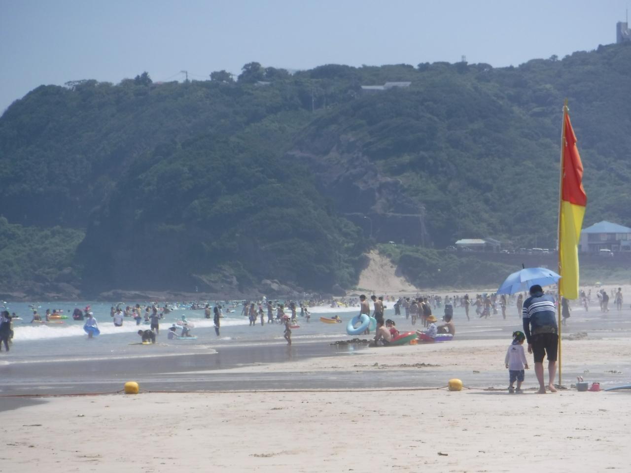 白浜は今日から海水浴規制が入り、中央が海水浴エリア
