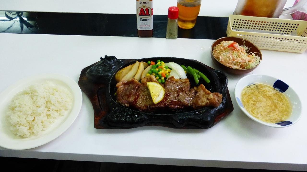 風雨が強くなる前に、「いちぎん食堂」でステーキの夕食を食べた時の様子です。