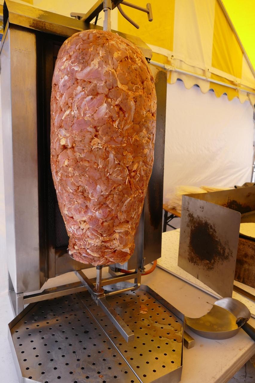 「ドネルケバブ」が釣り下げられていた。ドネルケバブとは、垂直の串に味付けされた肉(マトンか鶏肉)を上から刺していって積層し、水平に回転させながらそれを囲んだ縦形グリルの熱で外側から焼き、焼けた部分から肉の部分を削ぎ落していく。切り落した肉は皿に盛るか、またはパンにサラダと一緒に挟んで食べる。
