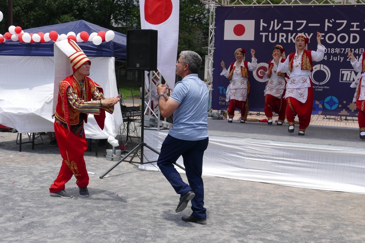 踊りが披露されていると、突然一人のトルコ人男性が前に出てきて一緒に踊り始めた。それに合わせて司会者も踊りの輪に加わった。